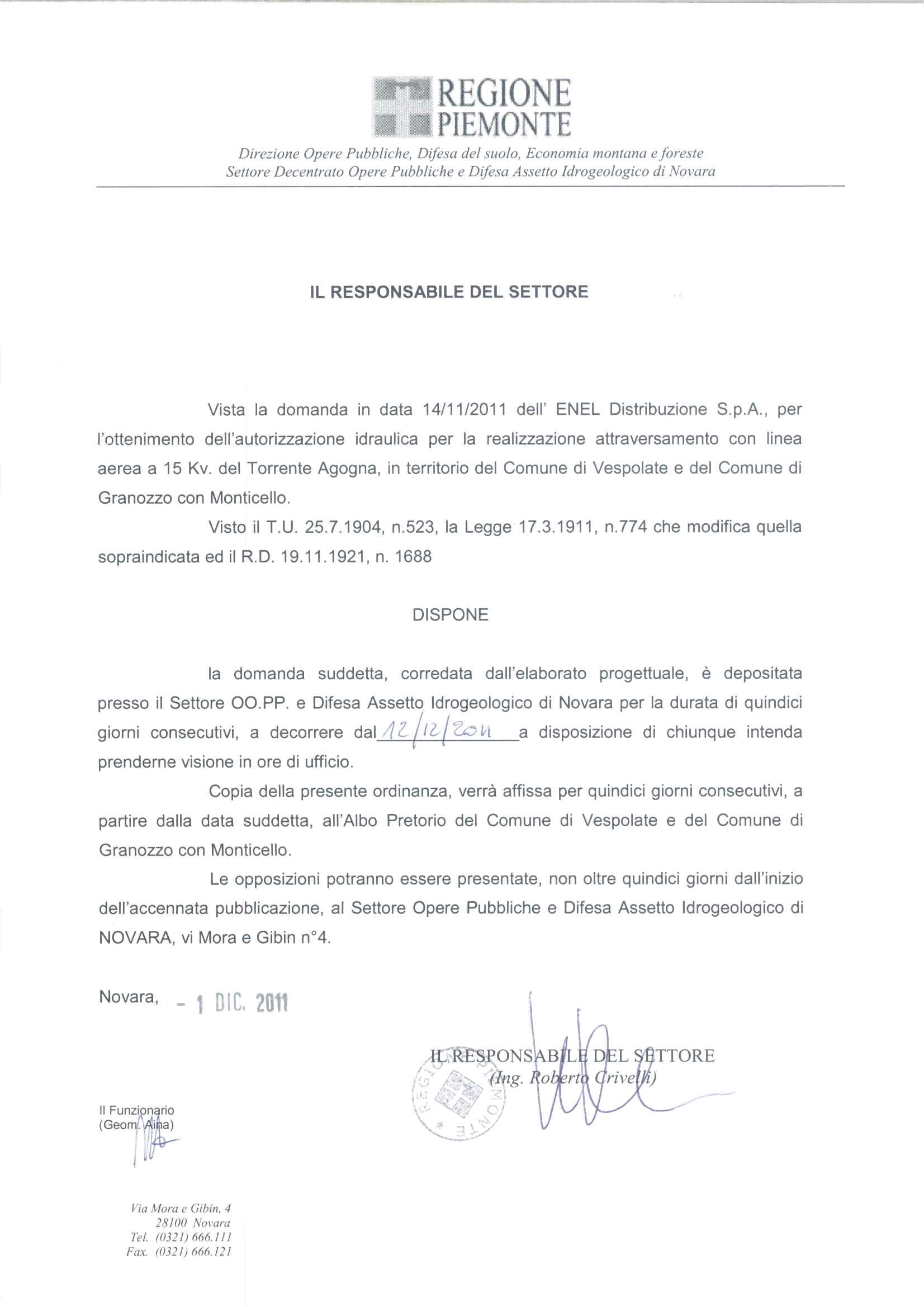 R.D. N. 523/1994 E L.R. 12/2004 - TORRENTE AGOGNA IN COMUNE DI VESPOLATE E GRANOZZO CON MONTICELLO. DOMANDA 14/11/2011 PER L'OTTENIMENTO DELL'AUTORIZZAZIONE PER LA REALIZZAZIONE DI ATTRAVERSAMENTO CON LINEA AEREA A 15 Kv. ITER 385204. DITTA ENEL S.P.A.