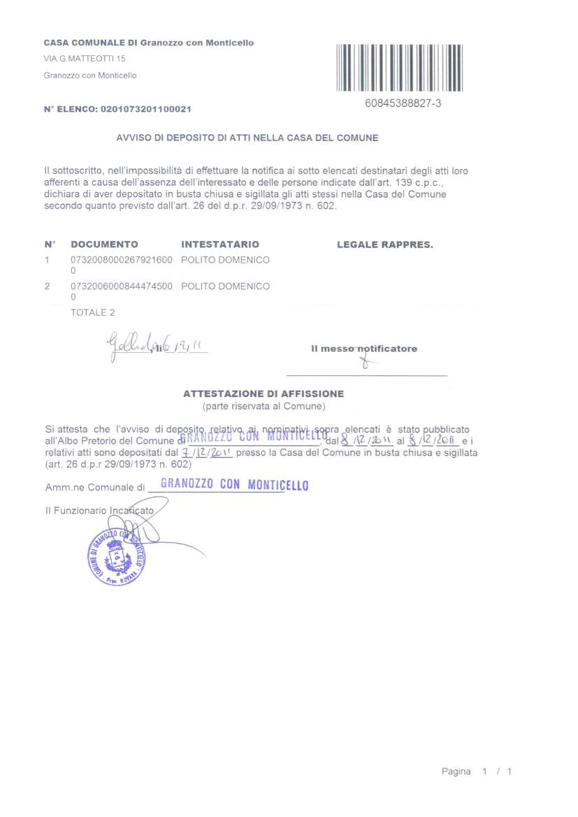 AVVISO DI DEPOSITO ATTI NELLA CASA COMUNALE - ELENCO N. 0201073201100021