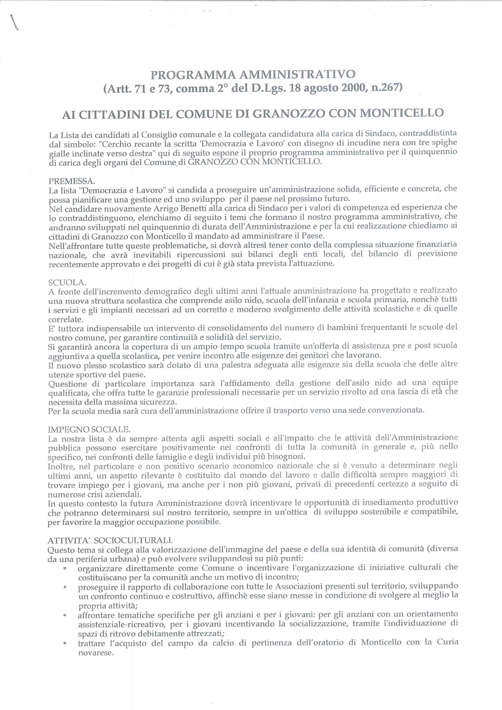PROGRAMMA AMMINISTRATIVO ELEZIONI COMUNALI DEL 15/05/2011 - LISTA CANDIDATO SINDACO ARRIGO BENETTI