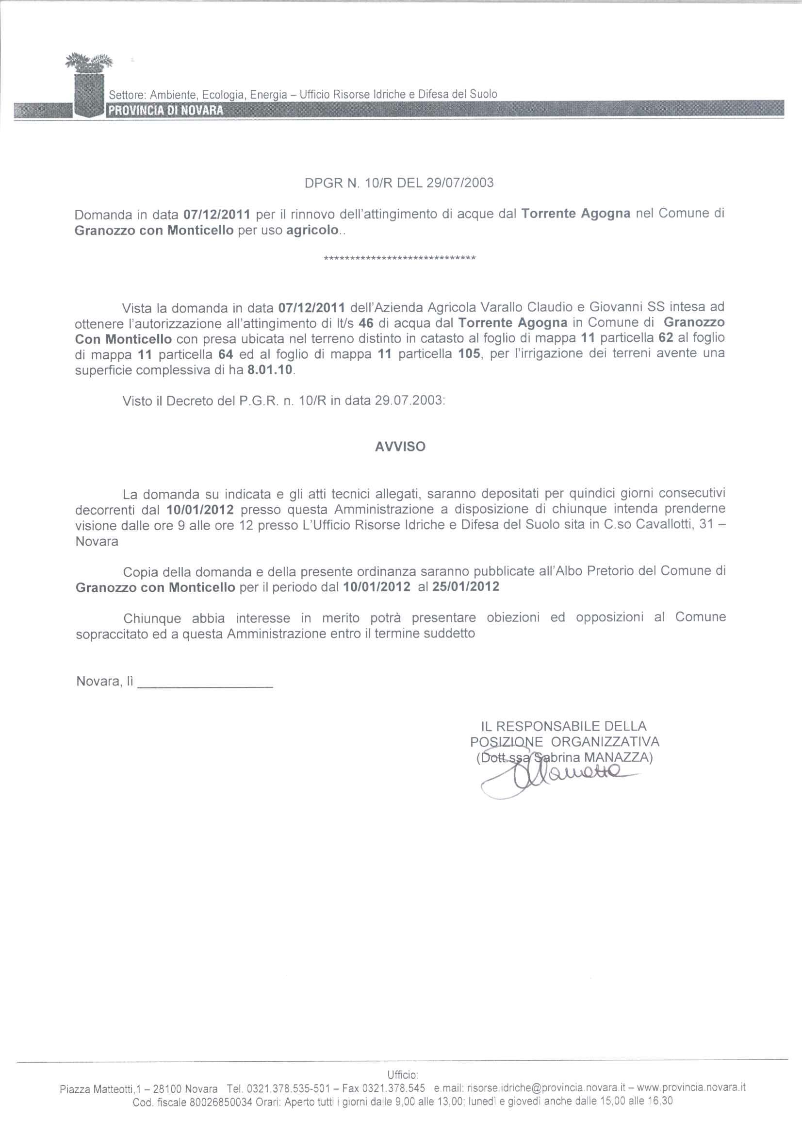 RINNOVO LICENZA DI ATTINGIMENTO DI ACQUE DAL TORRENTE AGOGNA NEL COMUNE DI GRANOZZO CON MONTICELLO PER USO AGRICOLO DALL'AZIENDA AGRICOLA VARALLO CLAUDIO E GIOVANNI SS