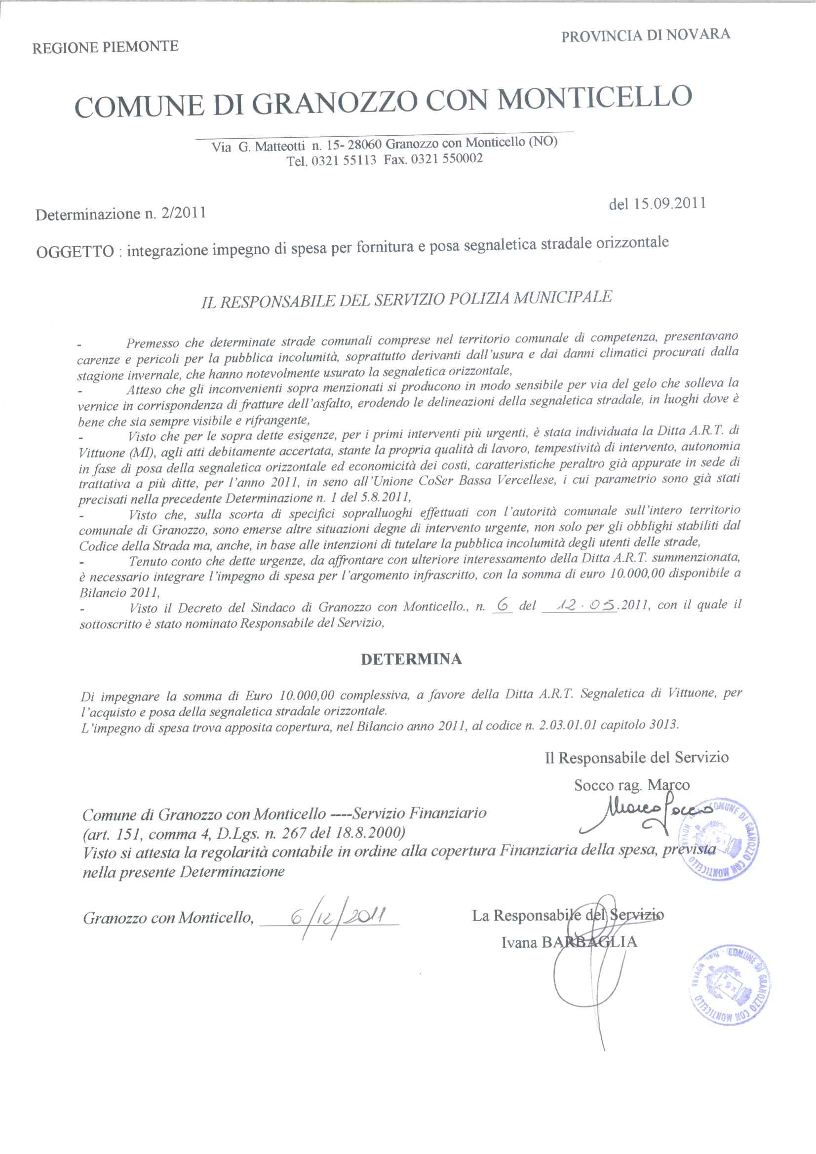 INTEGRAZIONE IMPEGNO DI SPESA PER FORNITURA E POSA SEGNALETICA STRADALE ORIZZONTALE.
