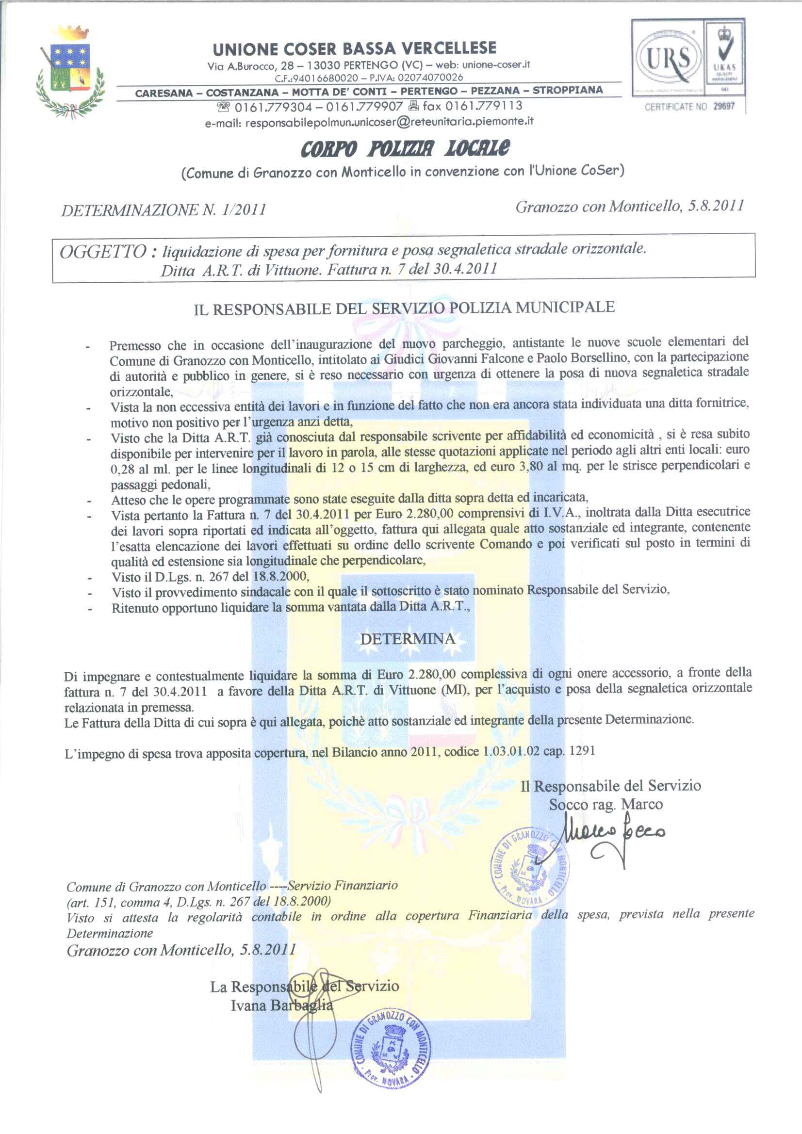 Liquidazione di spesa per fornitura e posa segnaletica stradale orizzontale ditta A.R.T. di Vittuone. Fattura n. 7 del 30.04.2011