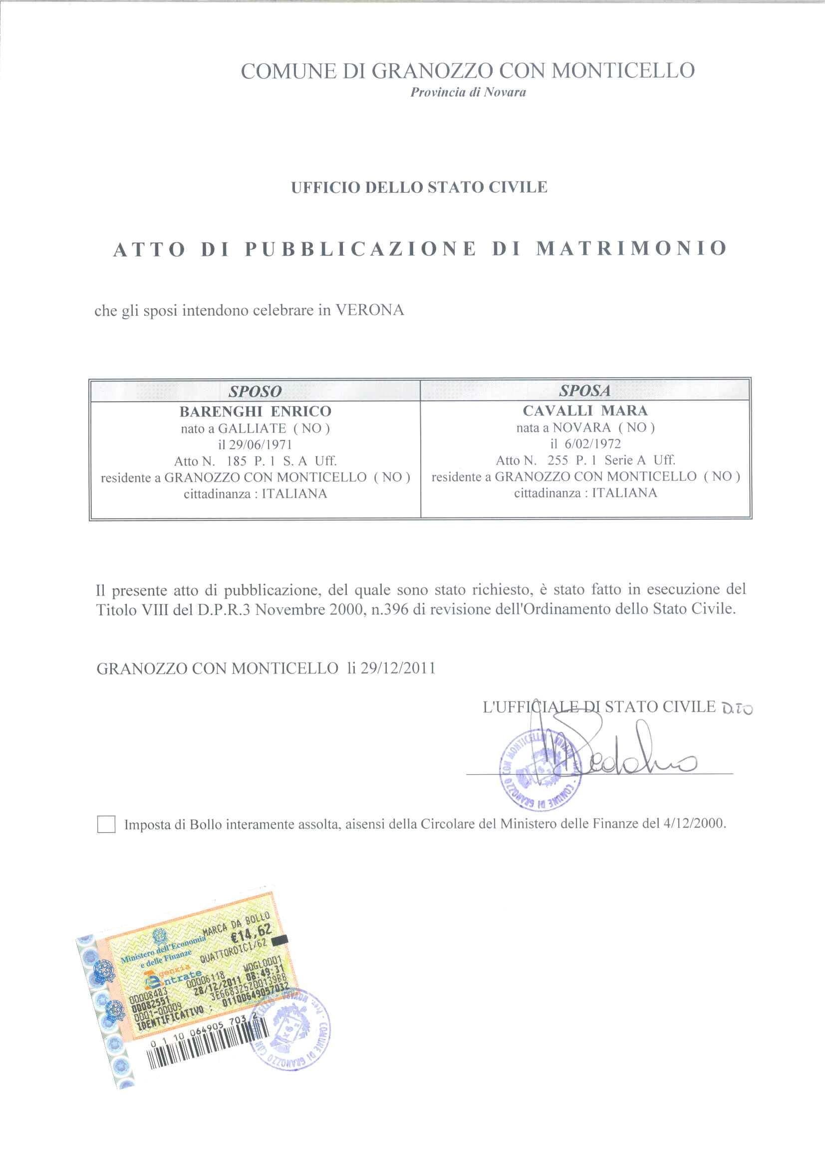 ATTO DI PUBBLICAZIONE DI MATRIMONIO - IL PRESENTE AVVISO RIMANE AFFISSO PER ALMENO OTTO GIORNI E, QUINDI FINO AL GIORNO 06.01.2012