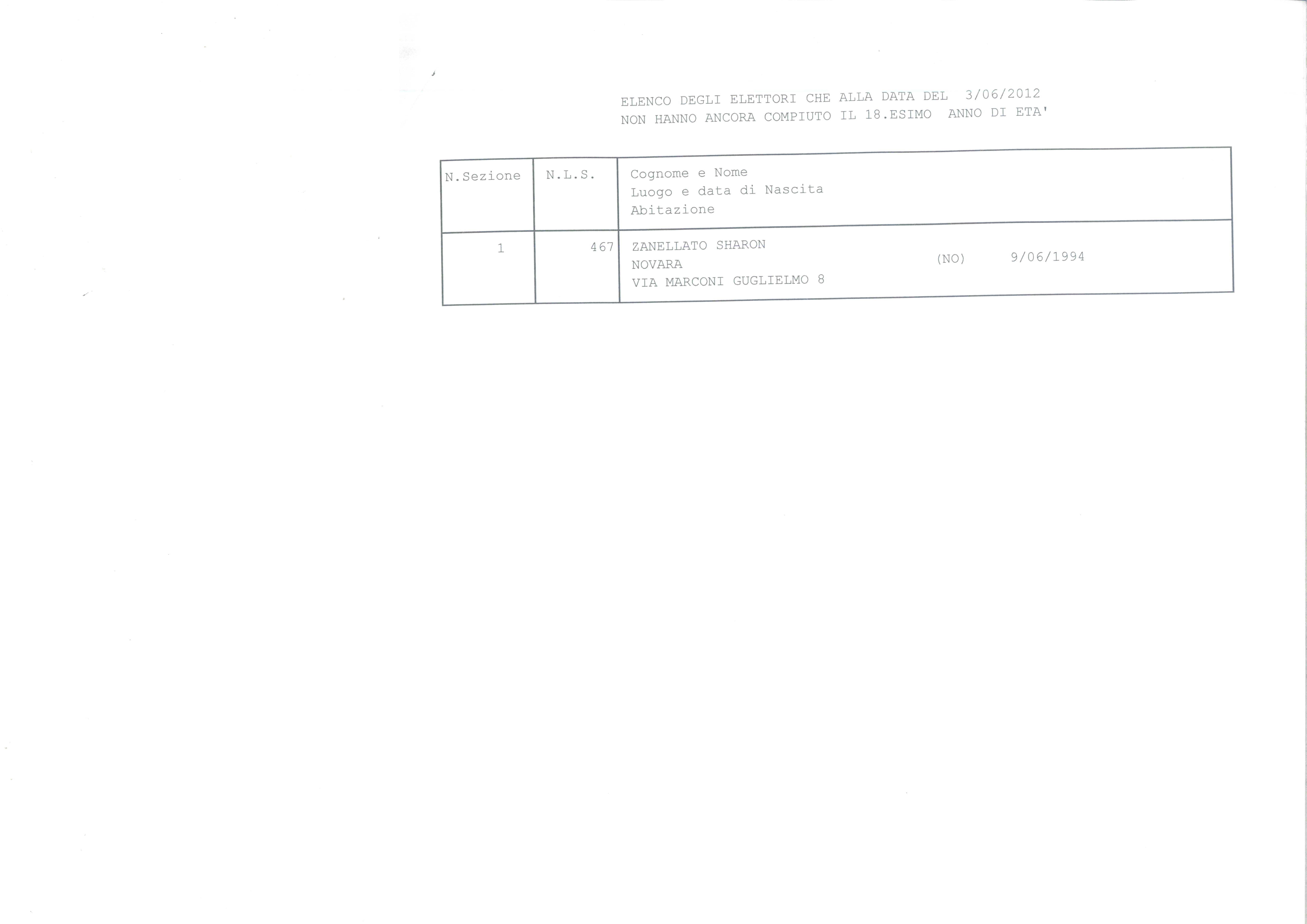 Elenco elettori che alla data del 03/06/2012 non avranno ancora compiuto il 18esimo anno di età.